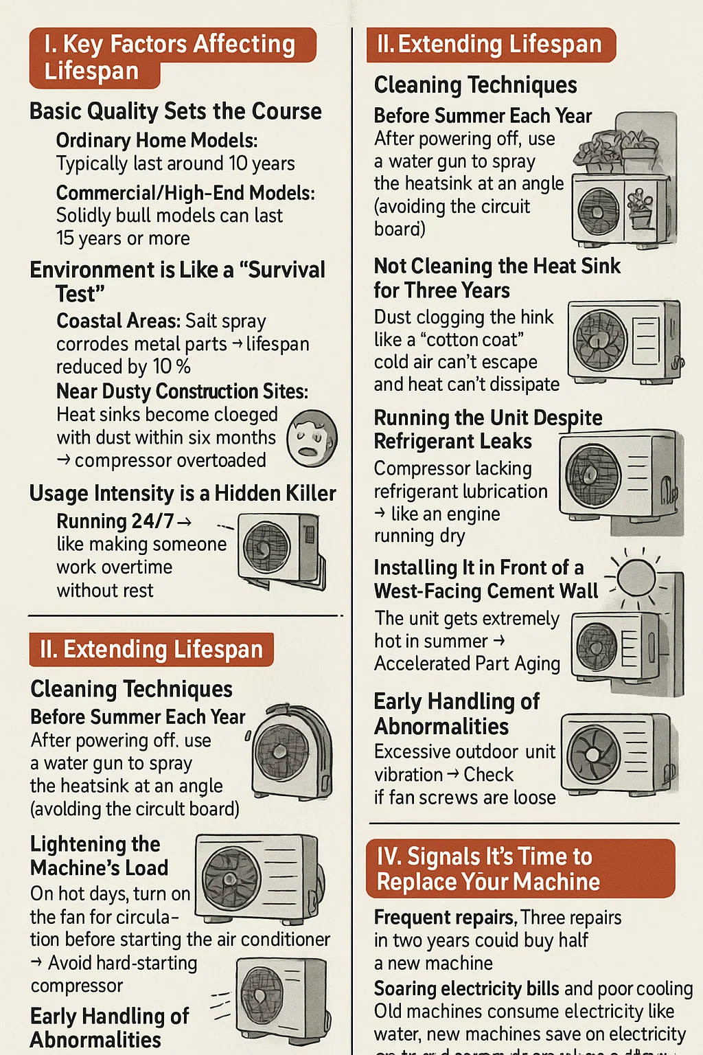 Perbaikan yang sering dilakukan: Tiga kali perbaikan dalam dua tahun dapat membeli setengah mesin baru. Tagihan listrik yang melonjak dan pendinginan yang buruk: Mesin-mesin lama mengkonsumsi listrik seperti air, mesin-mesin baru menghemat biaya listrik dan membayar sendiri dalam tiga tahun. Casing berkarat dan kabel terbuka: Bahaya keselamatan lebih besar daripada kegunaannya. Masih menggunakan refrigeran R22: Dihentikan selama bertahun-tahun, biaya perbaikannya sangat mahal.
