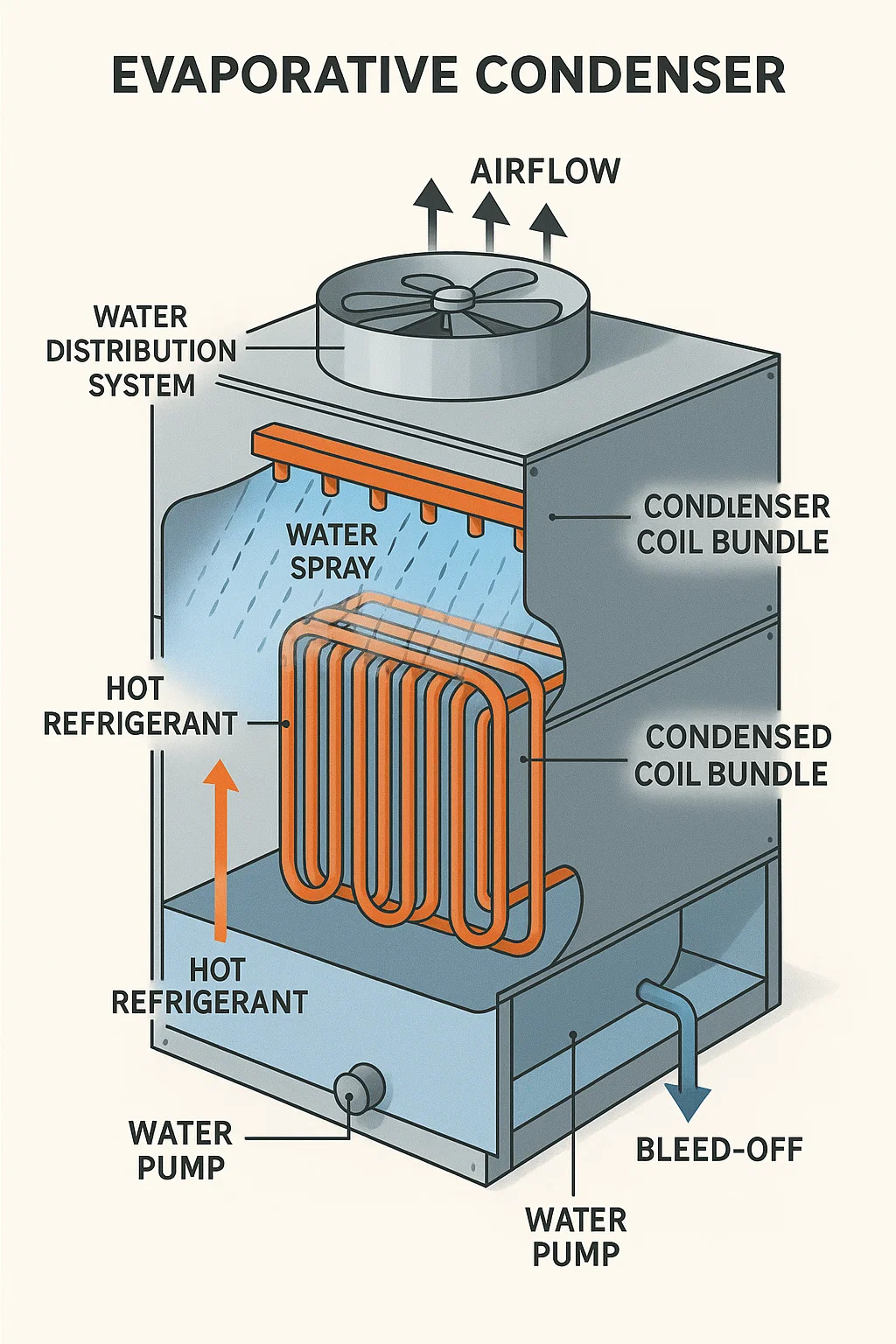 Sebuah kondensor evaporatif mengintegrasikan pendinginan udara dan penguapan air untuk menolak panas dari sistem pendingin. Desain dan pengoperasiannya berbeda secara mendasar dari kondensor berpendingin udara standar: